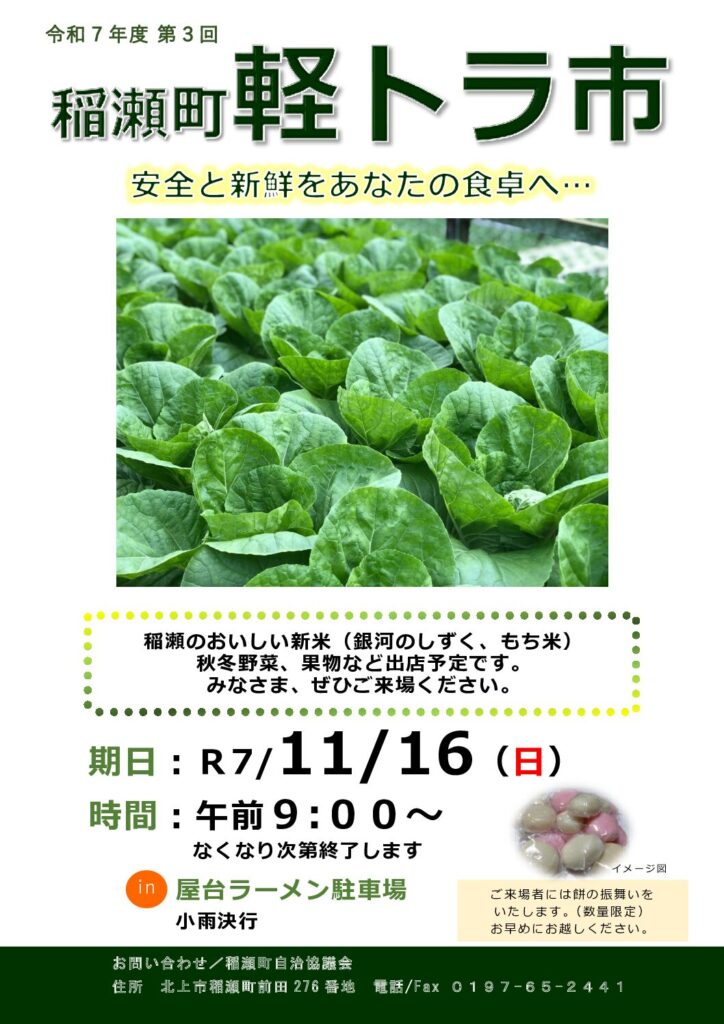 2025年11月10日 / 最終更新日時 : 2025年11月13日 投稿者01 稲瀬町自治協議会 イベント情報 令和7年度 第3回軽トラ市開催 第3回 稲瀬町軽トラ市を次の日程で開催します。 日時 令和7年11月16日(日) AM9:00~ 場所 屋台ラーメン 駐車場(小雨決行) 皆様お誘いの上、沢山のお越しをお待ちしております。 令和7年度 第3回軽トラ市チラシダウンロード